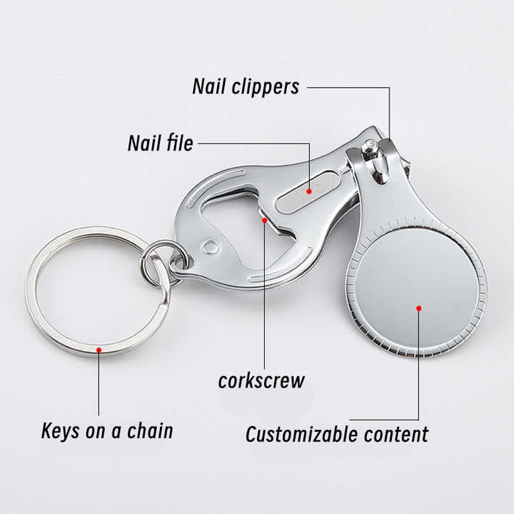 - 【MULTI FUNCTIONS】Four in one multi-function bottle opener with keychain, nail clipper, and nail file