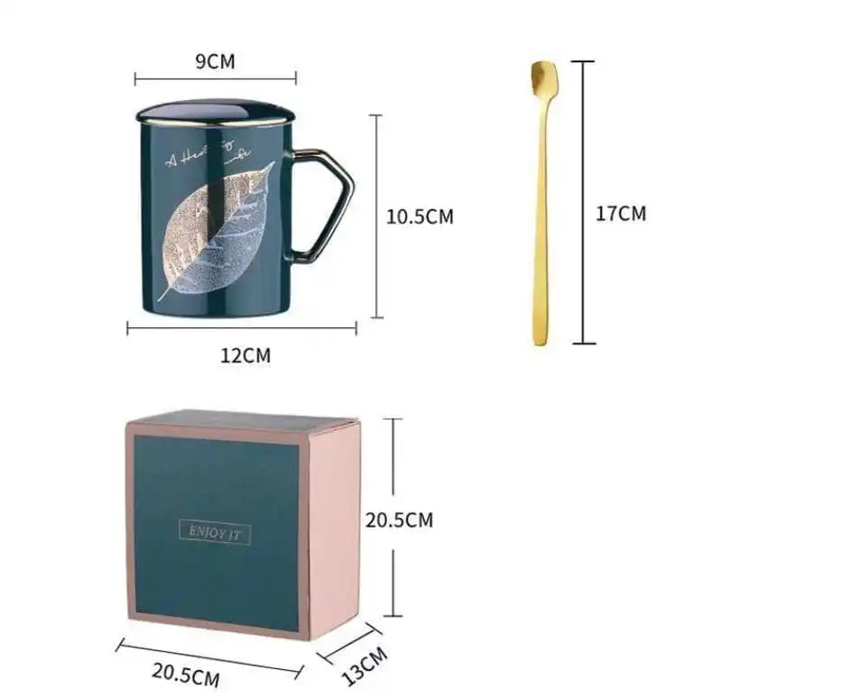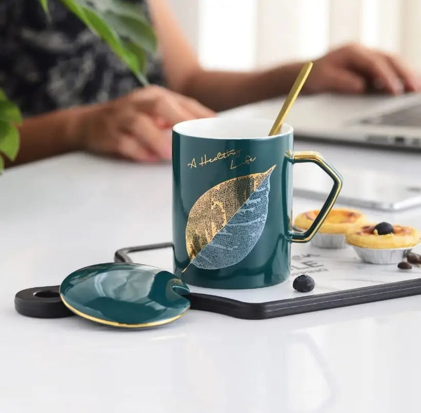 Buy Autumn Gold Leaf Mug with Lid & Spoon - DecorHomz – DecorHomz.com